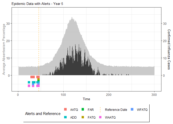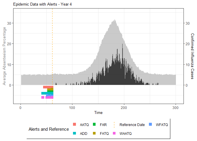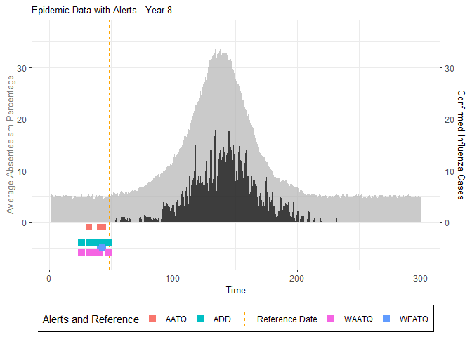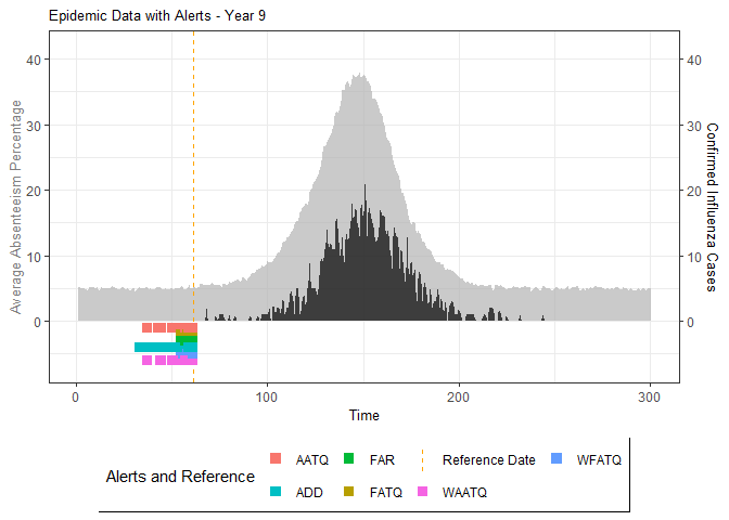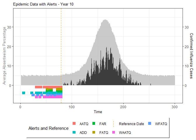 Madeline A. Ward published a paper on methods for detecting seasonal influenza epidemics using school absenteeism data. The premise is that there is a school absenteeism surveillance system established in Wellington-Dufferin-Guelph which uses a threshold-based (10% of students absent) approach to raise alarms for school illness outbreaks to implement mitigating measures. Two metrics (FAR and ADD) are proposed in that study that were found to be more accurate.