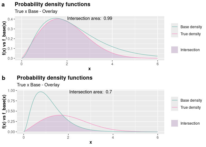 If you choose to specify a base density, it’s convenient to inspect it by comparing the base density function with the theoretical probability density function. The inspect() function facilitates this task. The inspect() function will plot the base probability density function and the theoretical probability density function, find the intersection between the densities, and display the value of the intersection area on the plot. These are important pieces of information to decide if the base probability density function specified in the args_f_base argument and the value of c (default is 1) are appropriate.