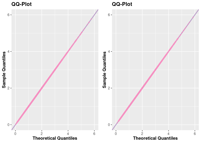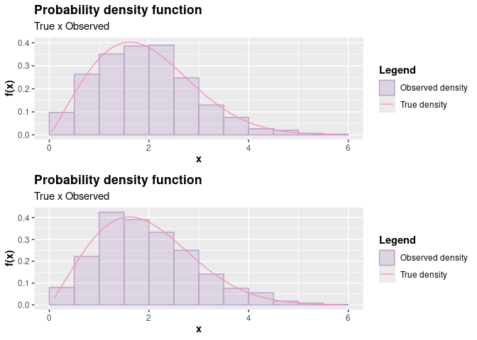 Since the probability of acceptance is \(1/c\), the accept_reject() function attempts to find the minimum value of \(c\) that satisfies the description above. Unless you have compelling reasons to provide a value for the c argument of the accept_reject() function, it is recommended to use c = NULL (default), allowing a value of \(c\) to be automatically determined.