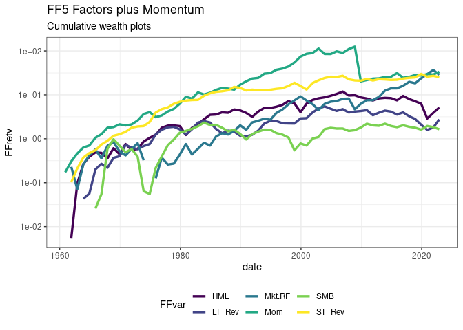labs(title="FF5 Factors plus Momentum", subtitle="Cumulative wealth plots",ylab="cum. returns") +