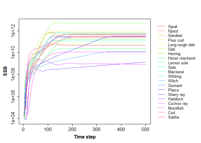 install.packages("LeMaRns")This is a basic example of how to set up, run and plot the resulting spawning-stock biomass: