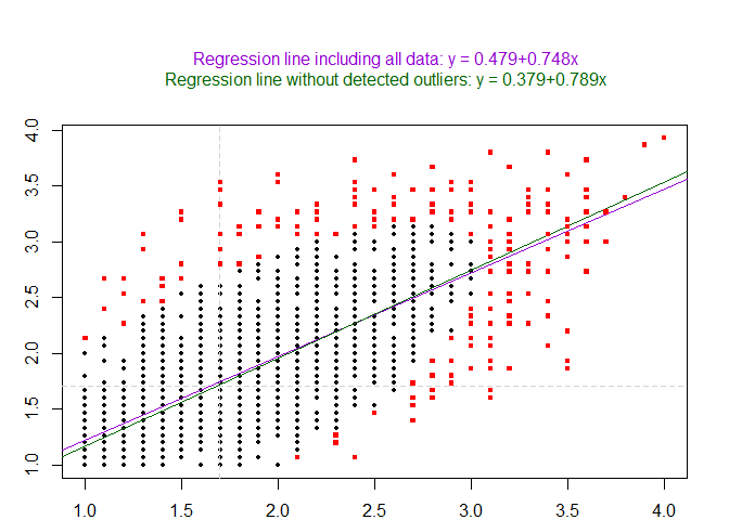 the plot function for the mcd method is very useful as it allows to compare the regression line with and without outliers (showing if there is a strong impact of outliers on the regression line):