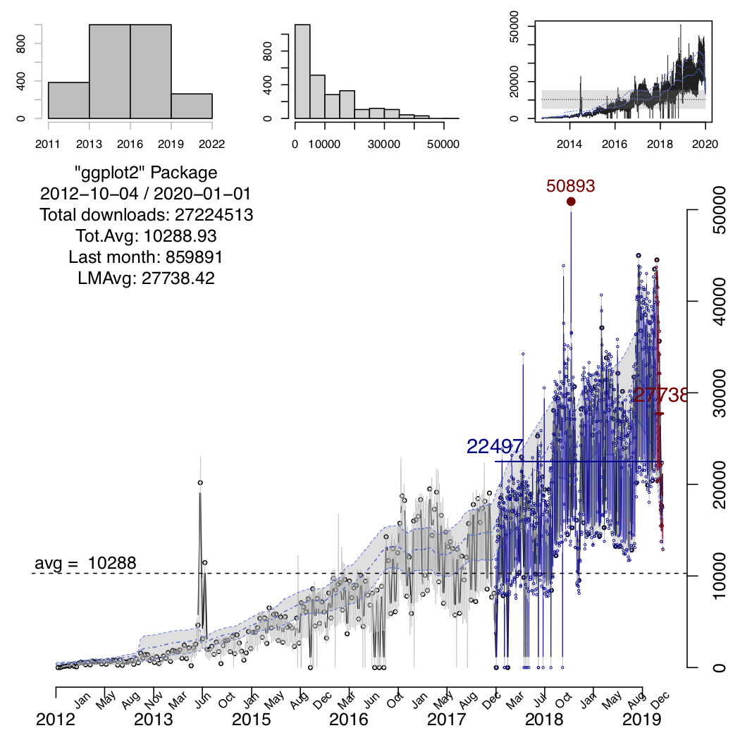 Two more “fixed” averages are presented in the main plot, indicating the average number of downloads for the package in the last two “units” of time, eg last month and last week, or last six-months and last month, etc. The absolute maximum number of downloads within the period of time, is also displayed as a filled dot and the actual value.