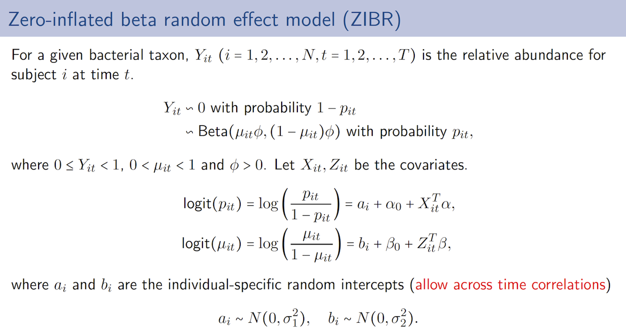 The ZIBR model combines the logistic regression and Beta regression in one model. Each regression part includes random effects to account for correlations acorss time points. We call these two regressions in ZIBR model as logistic component and Beta component. These two components model two different aspects of the data. The logistic component models presence/absence of the microbe and Beta component models non-zero microbial abundance.