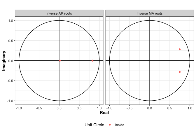 We have also implemented a plot.Arima2 function that uses the ggplot2 package so that we can visualize a fitted model. To compare the roots of the model fit using multiple restarts to the model fit using stats::arima, I will modify the class of the arma object so that it can easily be plotted: