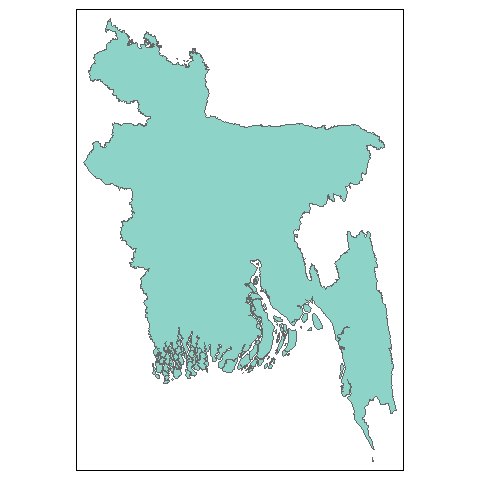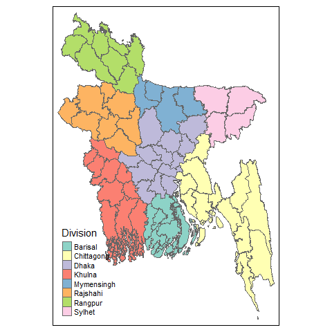 The bangladesh package provides ready-to-use shapefiles for different administrative regions of Bangladesh (e.g., Division, District, Upazila, and Union). Usually, it is difficult to plot choropleth maps for Bangladesh in R. This package will help users to draw thematic maps of administrative regions of Bangladesh easily as it comes with the sf objects for the boundaries and regions’ names in English. It also provides functions allowing users to efficiently get specific area maps and center coordinates for regions. Users can also search for a specific area and calculate the centroids of those areas.