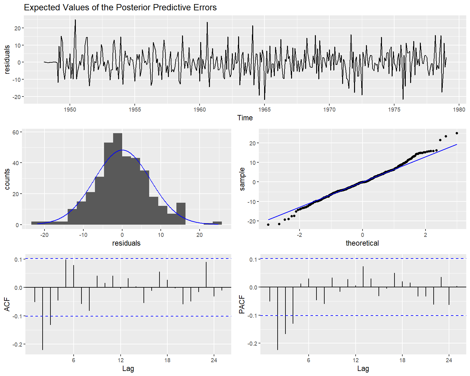 After fitting our model we can make a visual diagnostic of our parameters, check residuals and fitted values using the plot method. The package provides the posterior sample of every residual, but checking all of them is an exhausting task. An alternative, is checking the process generated by the residuals posterior estimate.