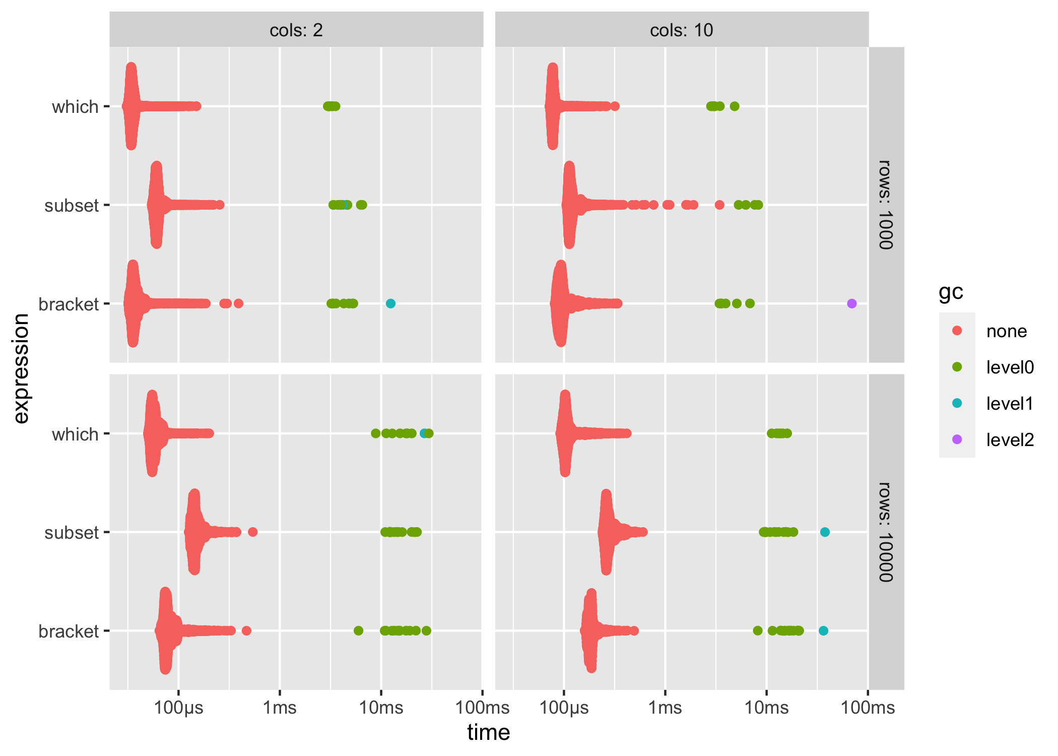 #> 2 dat[which(dat$x > 500), ] 124µs 168µs 6169. 260KB 33.2