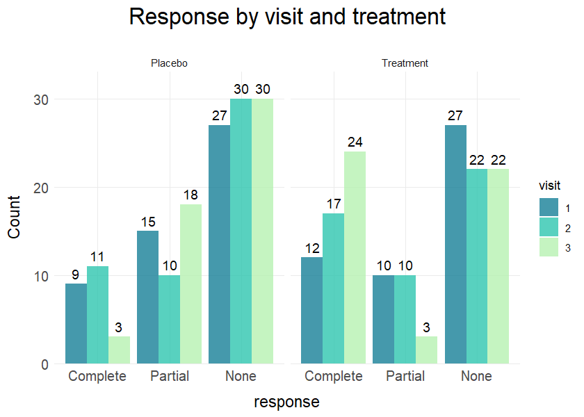 title = "Response by visit and treatment",values = TRUE)