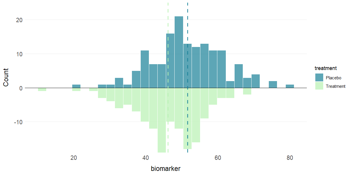 plot_hist(clinical_df, x = "biomarker", group = "treatment", stat = "mean")