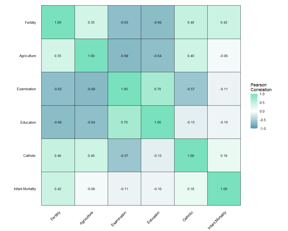 # Correlation matrix for base R dataset 'swiss'