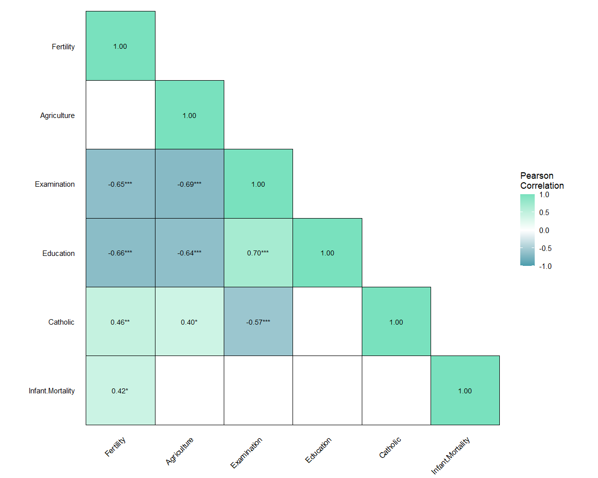 plot_corr(data = swiss, type = "lower", show_sig = TRUE, sig_only = TRUE)