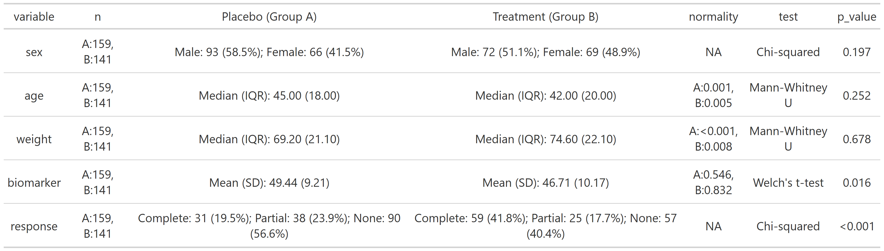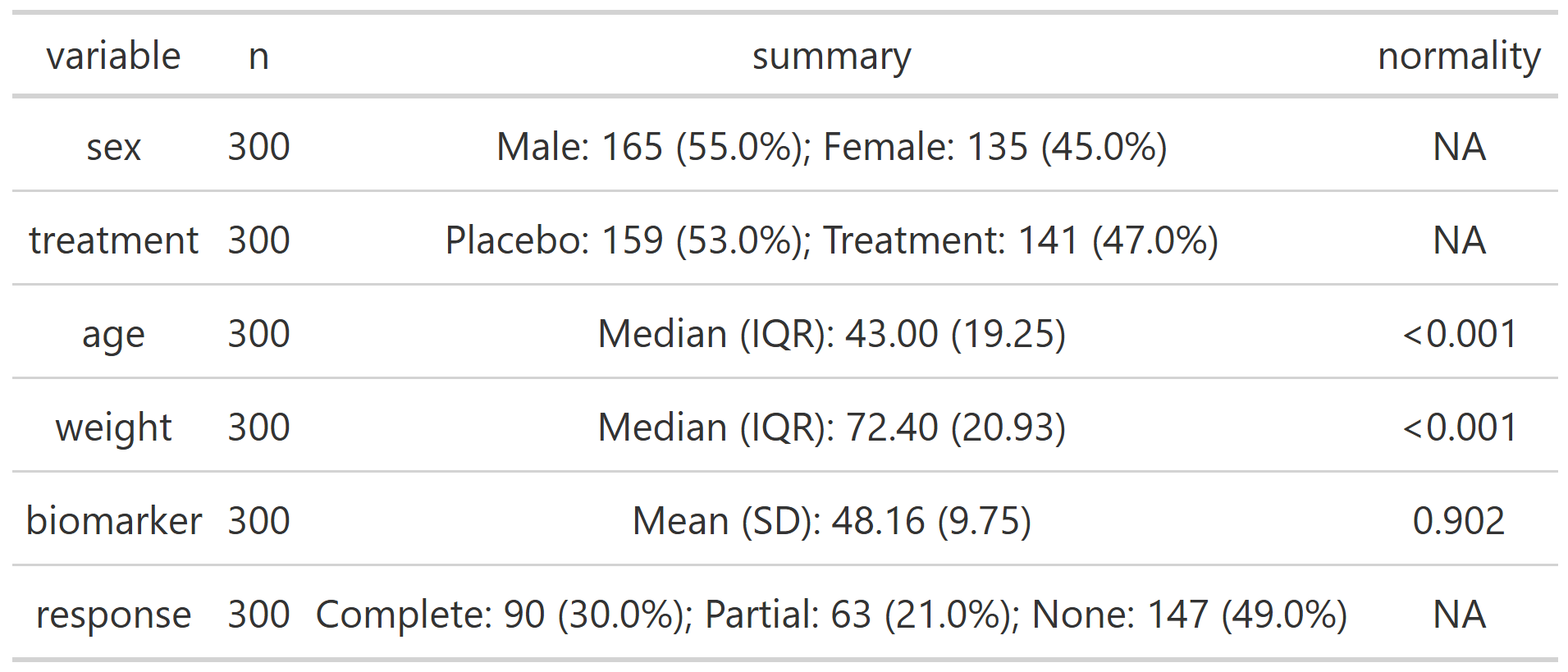 summary_table(clinical_df, group_by = 'treatment', exclude = c('participant_id', 'visit'))
