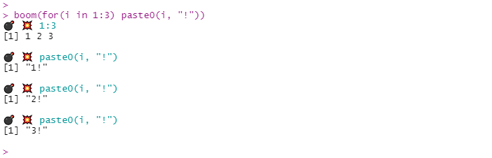 boom(for(i in 1:3) paste0(i, "!"))