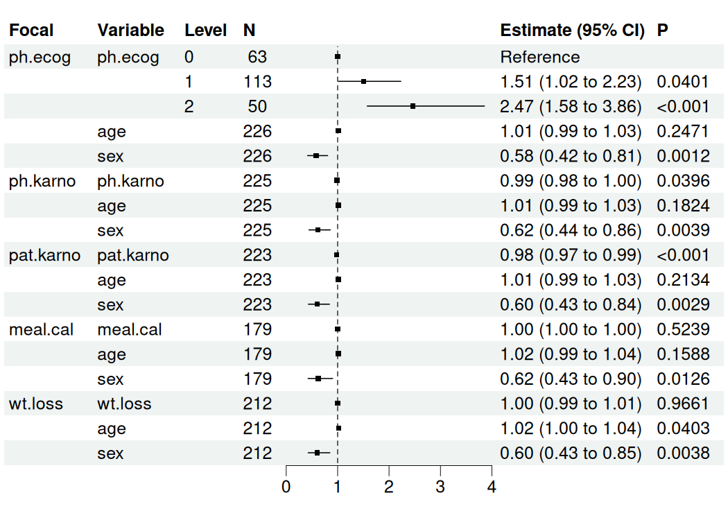 #> 7        ph.karno       sex     0.62      0.17     -2.88  0.004  [0.44, 0.86]