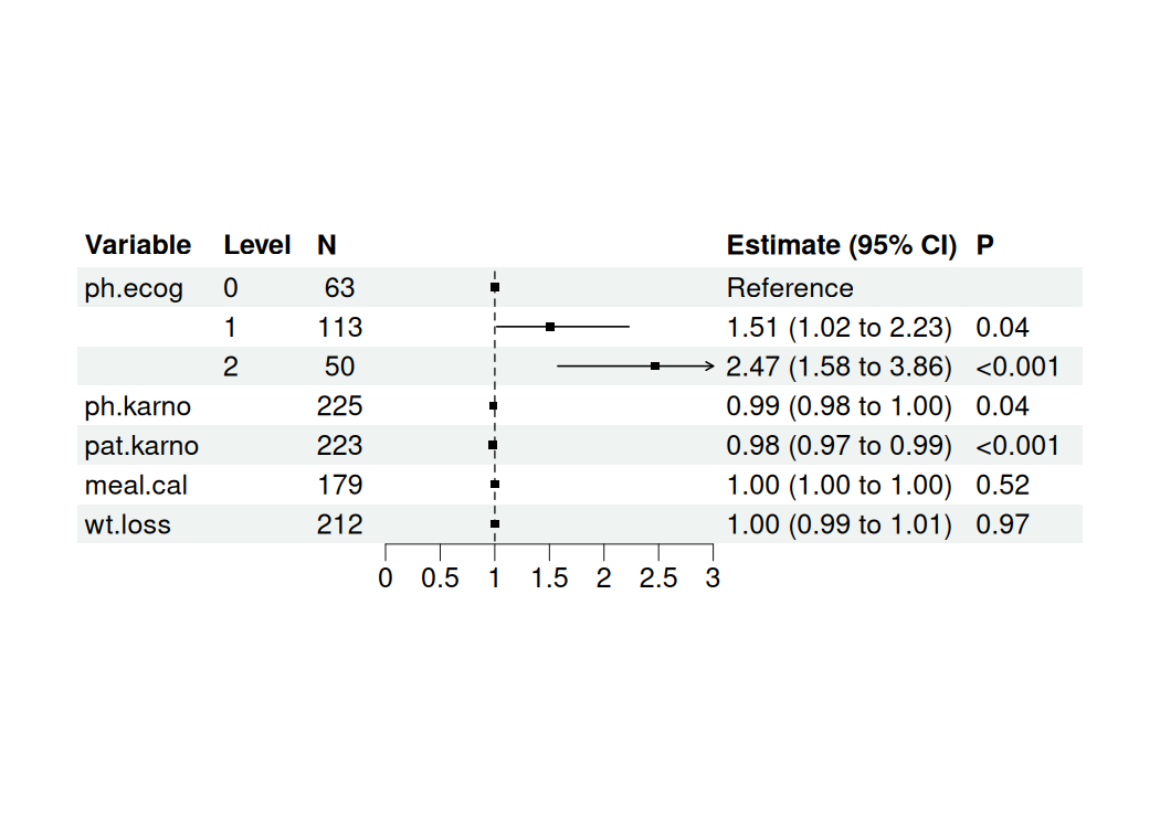 #> ph.karno       |  ph.karno |     0.99 |  5.95e-03 |     -2.06 |  0.040  | [0.98, 1.00]