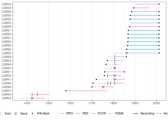 Malevich, Steven B., Christopher H. Guiterman, and Ellis Q. Margolis (2018) Burnr: Fire History Analysis and Graphics in R. Dendrochronologia 49: 9–15. DOI: 10.1016/j.dendro.2018.02.005.