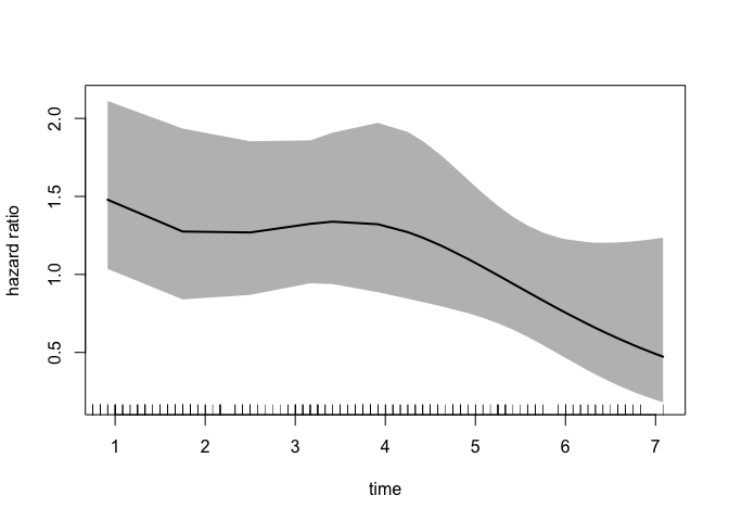We can also plot the time-dependent hazard ratio and 95% confidence band:
