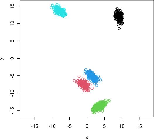 plot(x$points, col = x$clusters, xlab = "x", ylab = "y", asp = 1)