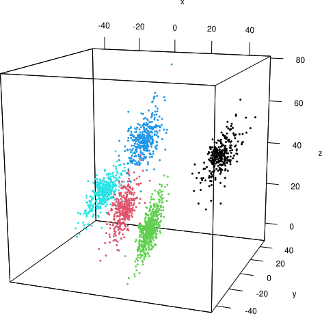 plot3d(x$points, col = x$clusters, xlab = "x", ylab = "y", zlab = "z", aspect = T)