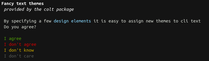 Colt is aimed at package developers that want to create themeable command line output. It is a simple wrapper around the crayon package.