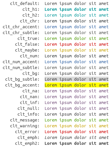 A colt theme is created with the colt_theme() constructor. A colt theme is just a list of functions that get applied to the text. A print method exists for previewing themes. Colt styles are named semantically rather than directly with a color (e.g. “yes” instead of “green”).