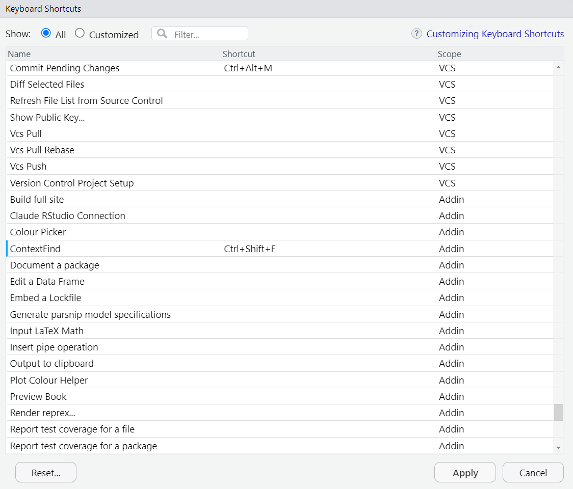 install.packages("contextFind")After installing contextFind, restart RStudio, then set contextFind to a hotkey by selecting Tools >> Modify Keyboard Shortcuts: