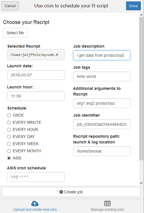 cron_add(command = cmd, frequency = 'minutely', id = 'test1', description = 'My process 1', tags = c('lab', 'xyz'))