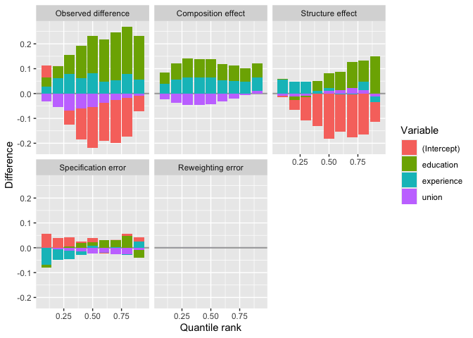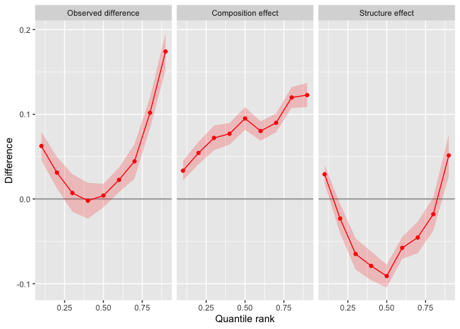 The package contains generic summary, print and plot functions for the results and computes standard errors. This documentation provides a brief overview of the functions implemented in the package. For a more detailed discussion of decomposition methods, including their respective assumptions and limitations, refer to Fortin, Lemieux, and Firpo (2011) and Firpo et al. (2018).