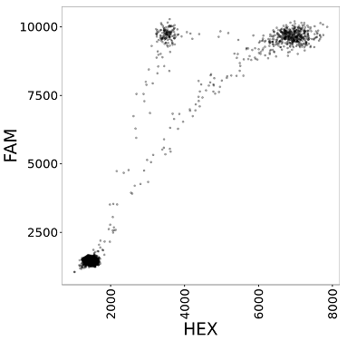 Droplet Digital PCR (ddPCR) is a technology provided by Bio-Rad for performing digital PCR. The basic workflow of ddPCR involves three main steps: partitioning sample DNA into 20,000 droplets, PCR amplification of the nucleic acid in each droplet, and finally passing the droplets through a reader that detects fluorescence in two different wavelengths (generally set to detect FAM and HEX dyes). As a result, the data obtained from a ddPCR experiment can be visualized as a 2D scatterplot (one dimension is FAM intensity and the other dimension is HEX intensity) with 20,000 points (each droplet represents a point). The following figure is an example of a scatterplot from ddPCR data.