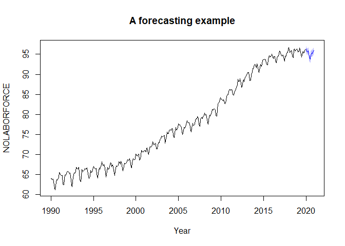 plot(fc, xlab = "Year", main = "A forecasting example")