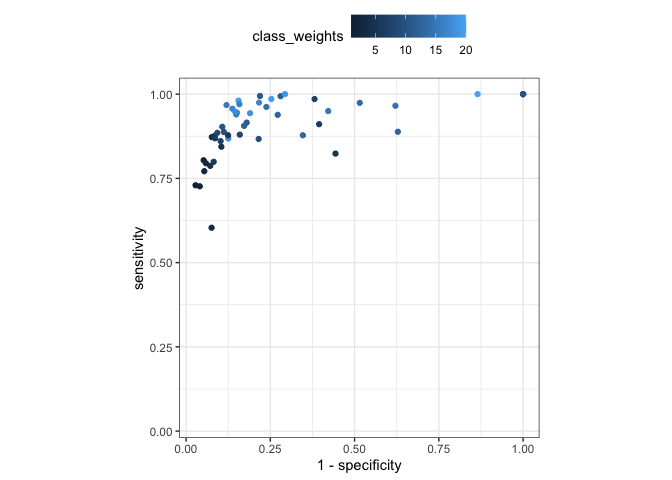 ggplot(aes(1 - specificity, sensitivity, col = class_weights)) +