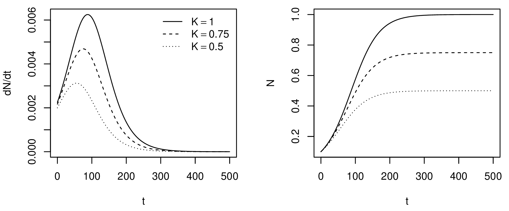 Figure 1. Number of new individuals (left) and total population size (right) over time for different carrying capacities.