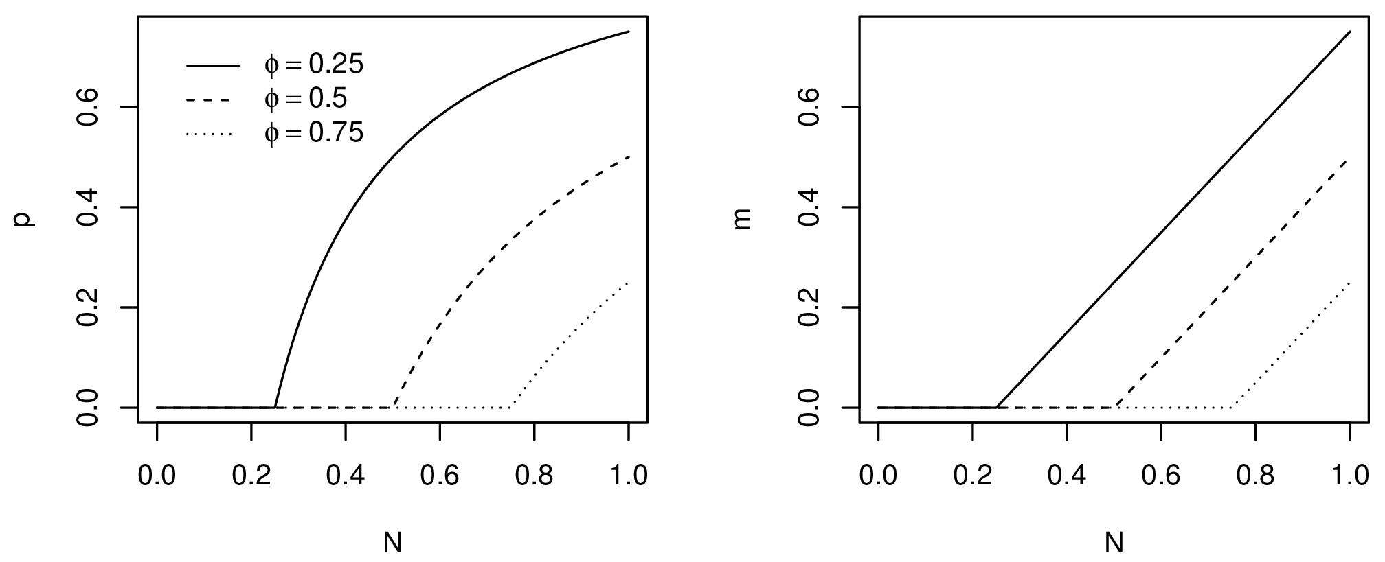 \[ p(N_t) = \begin{cases} 0 & \text{if } \phi \leq \frac{N_t}{K} \\ 1 - \frac{\phi}{N_t/K} & \text{otherwise} \end{cases} \]
