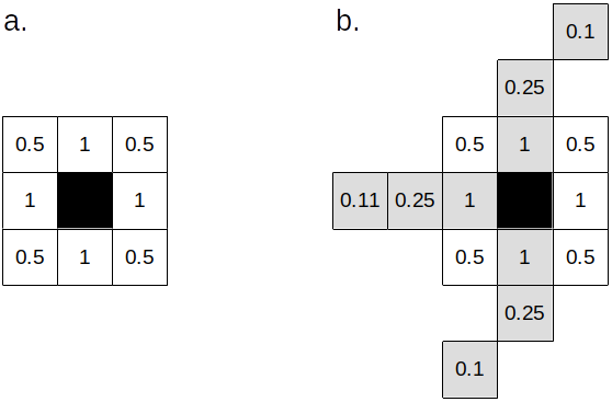 Figure 3. a. Cells considered for migration in normal terrain. b. Cells considered for migration in a corridor (light grey cells) with acceleration=3. Values are the inverse of the square distance to each cell.