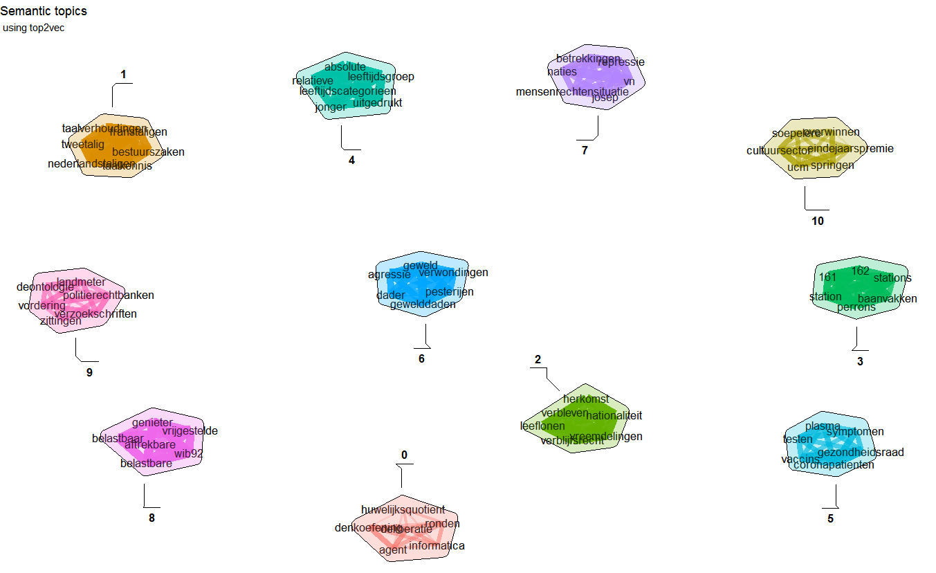 nn <- predict(model, newdata = sentences, type = "nearest", which = "sent2doc", top_n = 5)Top2vec clusters document semantically and finds most semantically relevant terms for each topic
