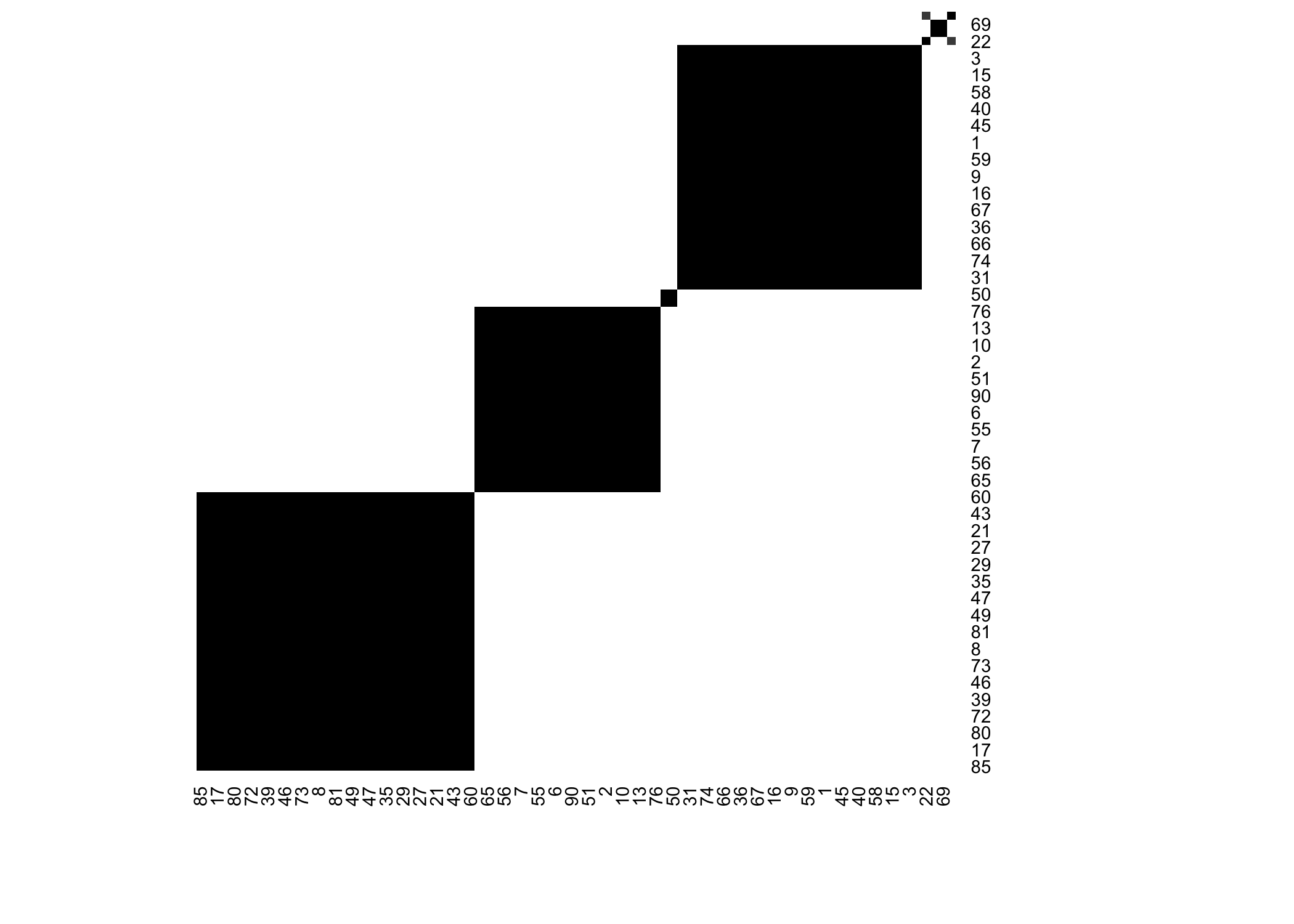 #> [1] 0.9324973To evaluate how well our tree captures the structure of the RF and replicates its classification, we introduce a procedure to measure the goodness of explainability. We start by visualizing the final partition generated by the RF through a heatmap — a graphical representation of the co-occurrence matrix, which reflects how often pairs of observations are grouped together across the ensemble. Each cell shows a pairwise similarity: the darker the cell, the closer to 1 the similarity — meaning the two observations were frequently assigned to the same leaf. Comparing these two matrices — both visually and statistically — allows us to assess how well E2Tree reproduces the ensemble structure. To formally test this alignment, we use the Mantel test, a statistical method that quantifies the correlation between the two matrices. The Mantel test is a non-parametric method used to assess the correlation between two distance or similarity matrices. It is particularly useful when we are interested to study the relationships between dissimilarity structures. The test uses permutation to generate a null distribution, comparing the observed statistic against values obtained under random reordering.