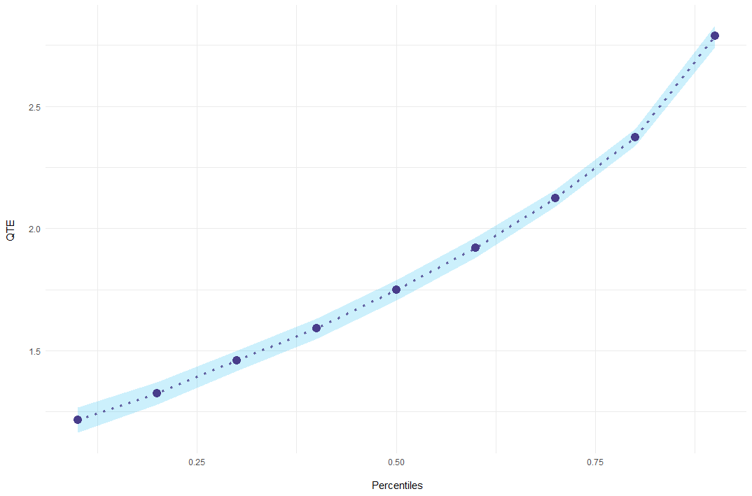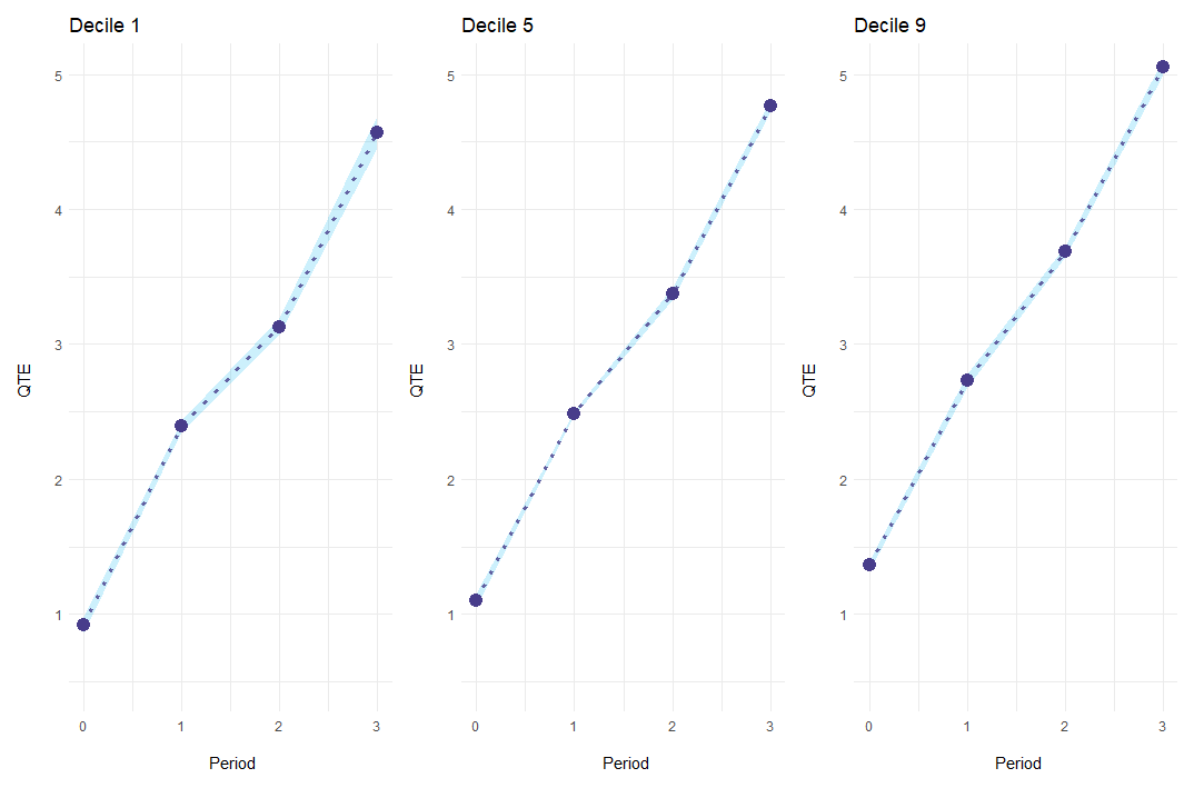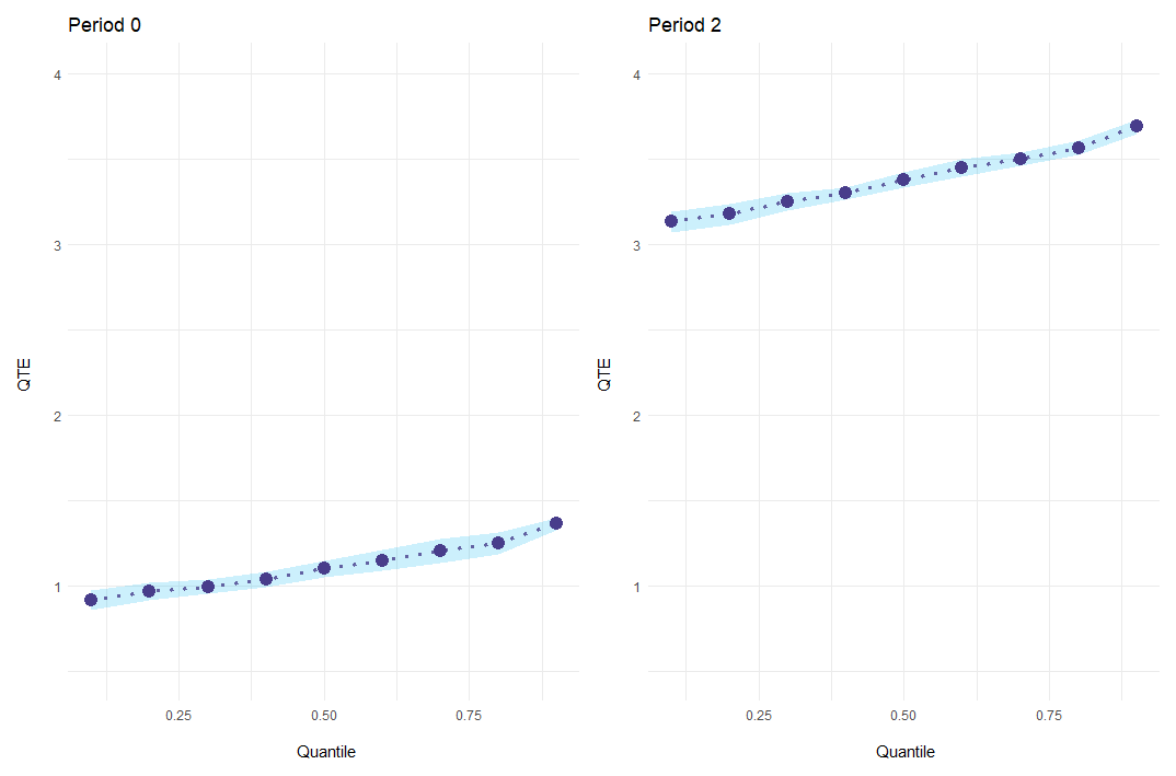 Yet, since it is not allowed to simply average quantile treatment effects, we must first store the empirical CDF of \(Y(1)\) and \(Y(0)\) for every two-by-two case. Next, I aggregate all estimated CDFs to get the plug-in estimates of \(Y(1)\) and \(Y(0)\), weighting for the cohort sizes. Finally, I invert them to get the quantile function and compute the quantile treatment effect as in the standard case.
