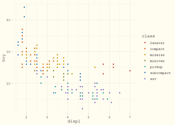 geom_point(aes(displ, hwy, colour = class)) +