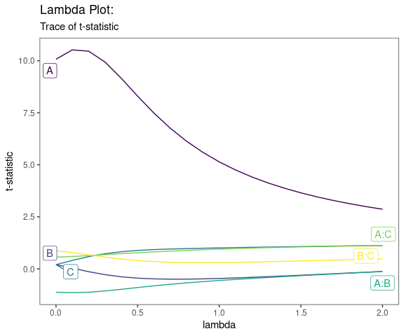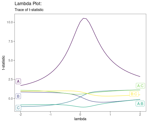 Obtain the trace plot of the t-statistics after applying Boxcox transformation across a specified sequence of lambda values
