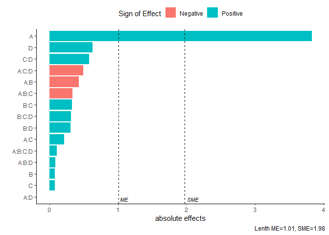 Pareto plot of effects with cutoff values for the margin of error (ME) and simultaneous margin of error (SME)