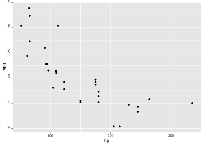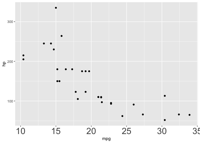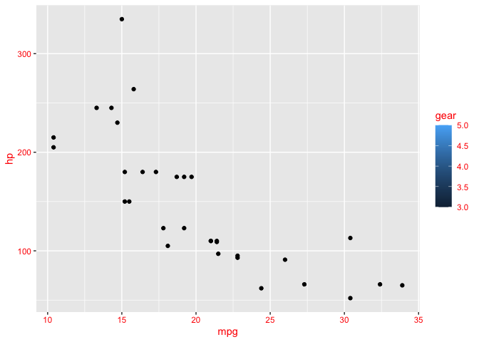 ggplot(mtcars, aes(wt, mpg, colour = cyl, size = hp)) +