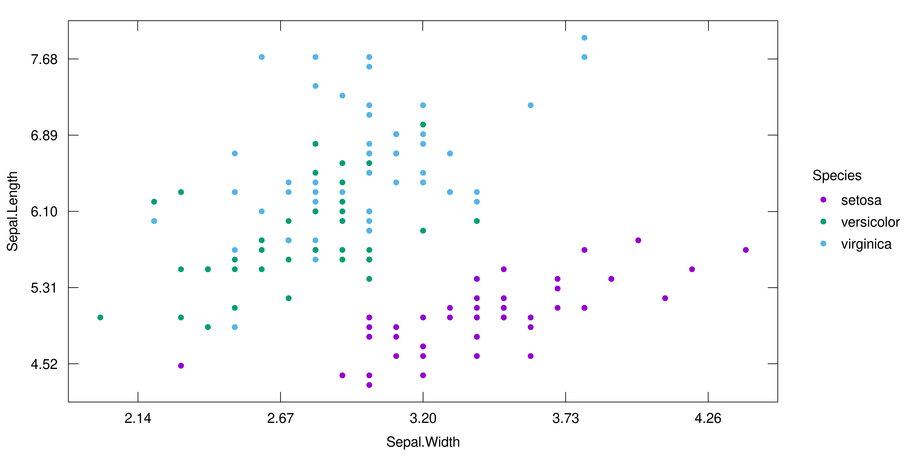 ggplot(iris, aes(Sepal.Width, Sepal.Length, color = Species)) +
