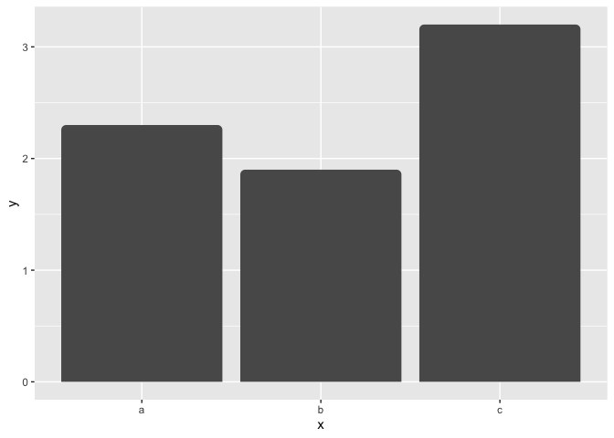 ggplot(data.frame(x = letters[1:3], y = c(2.3, 1.9, 3.2)), aes(x, y)) +