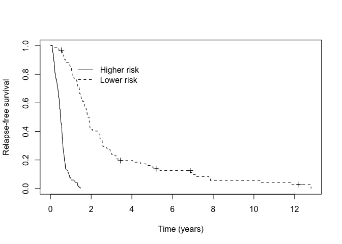 km_cured <- survfit(Surv(cryr, relapse.death) ~ p_group, data = amltrain)
