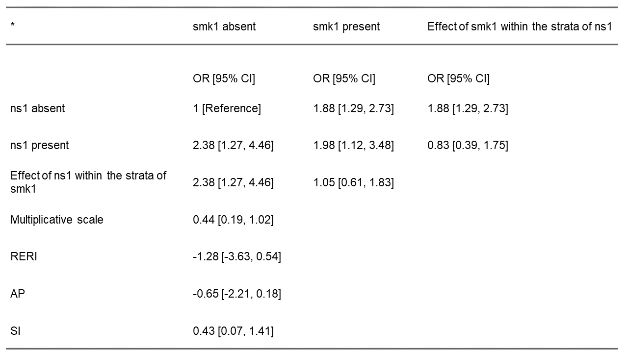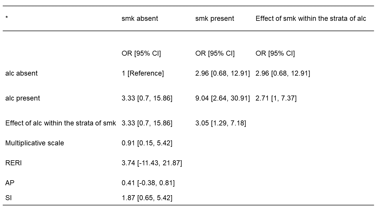 table_object = interactionR(model.glm, exposure_names = c("alc", "smk"), ci.type = "mover", ci.level = 0.95, em = F, recode = F)