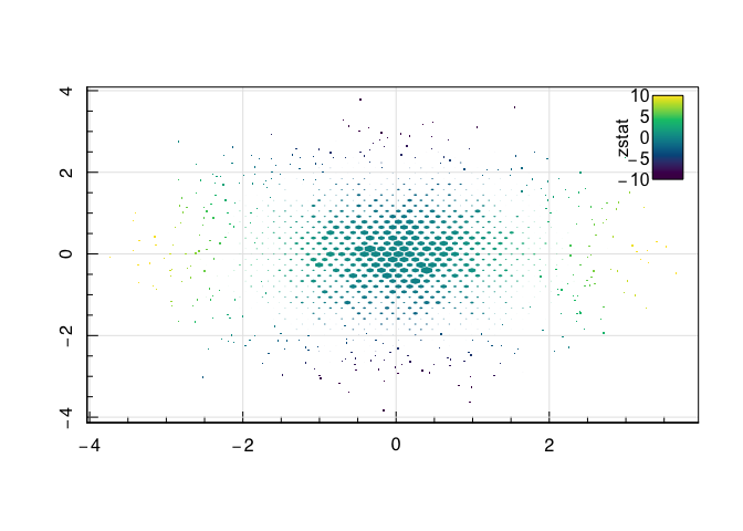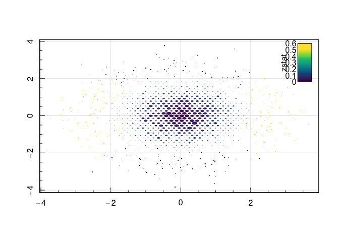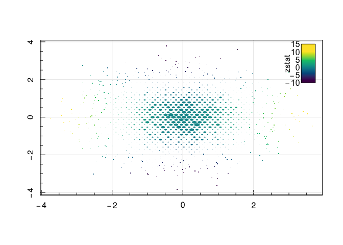 magbin(xydata, z=xydata[,1]^2-xydata[,2]^2, colref='zstat', sizeref='count',