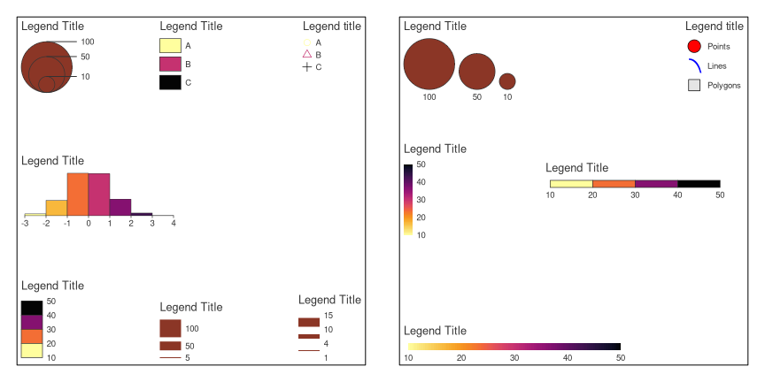 Create legends for maps and other graphics. Thematic maps need to be accompanied by legible legends to be fully comprehensible. This package offers a wide range of legends useful for cartography, some of which may also be useful for other types of graphics.