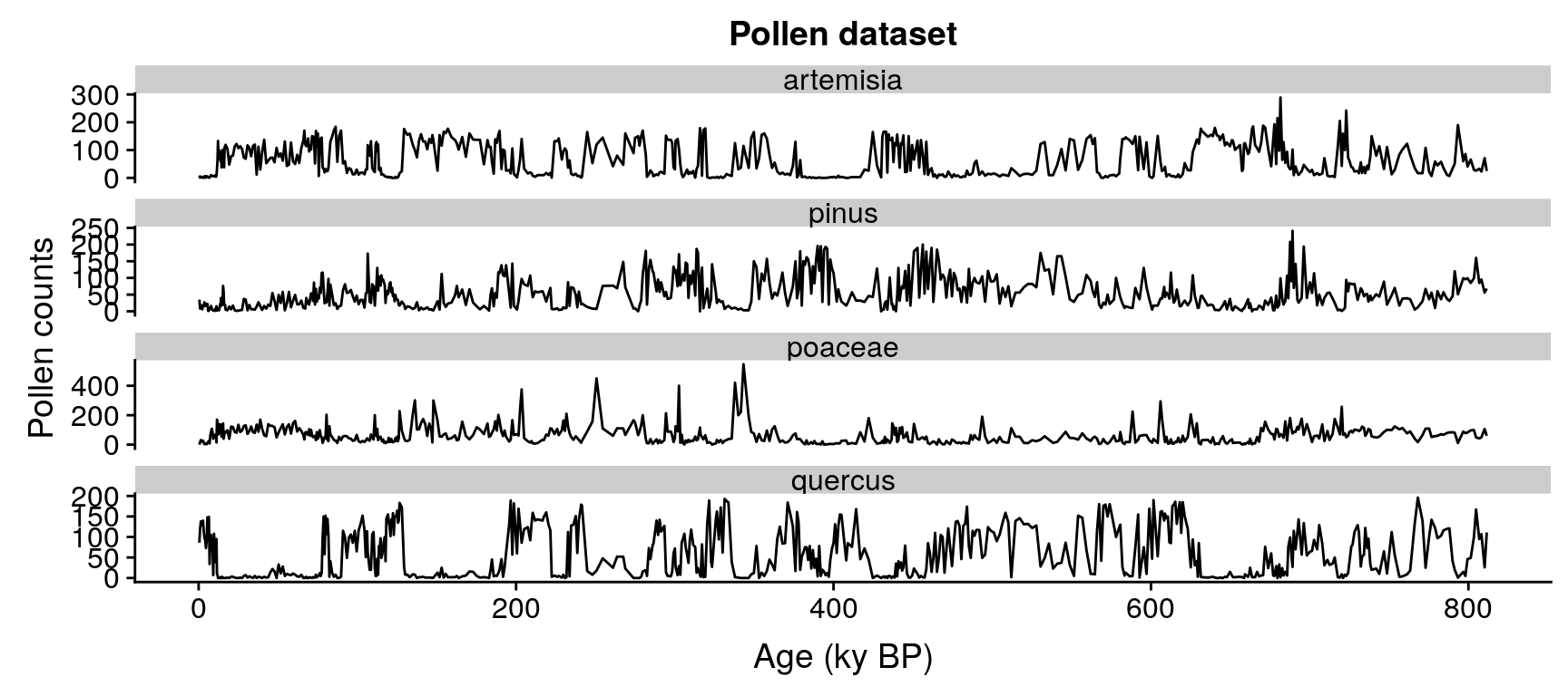 pollen, with 639 samples dated in ky BP and four pollen types: Pinus, Quercus, Poaceae, and Artemisia.