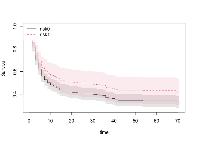 out1 <- resmeanATE(Event(time,cause)~tcell+platelet,data=bmt,cause=1,time=40,